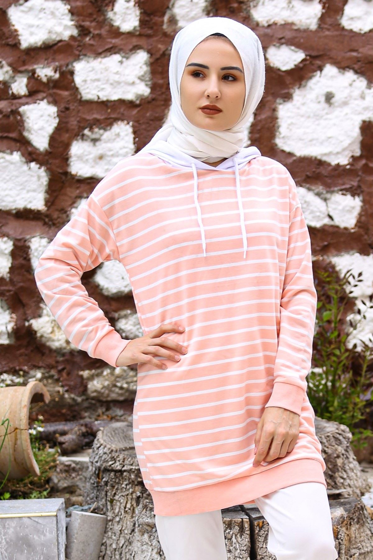 Kapşonlu Çizgili Tunik Pudra - 4366.102.