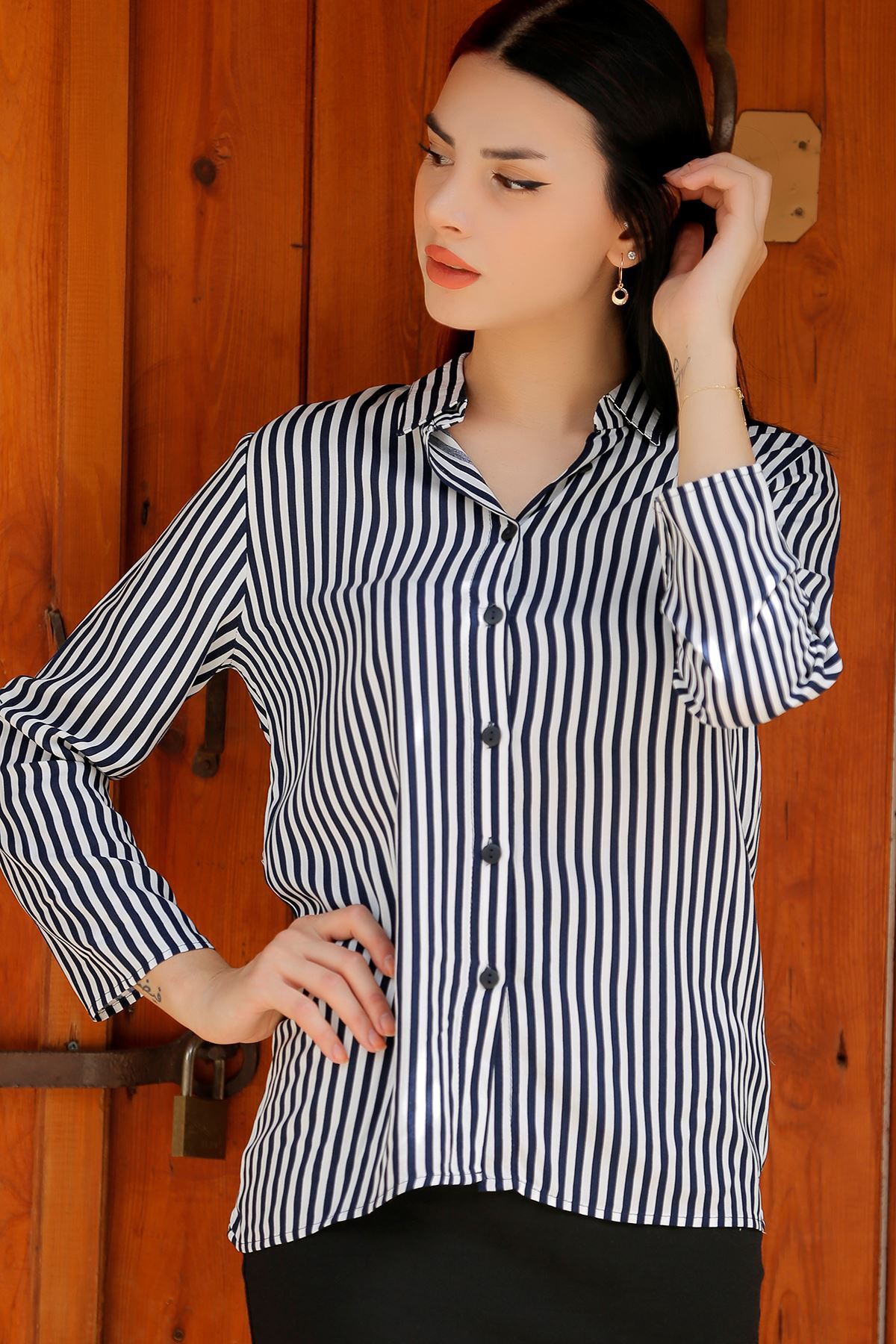 Katlamalı Kol Gömlek Laciçizgili - 3800.128.