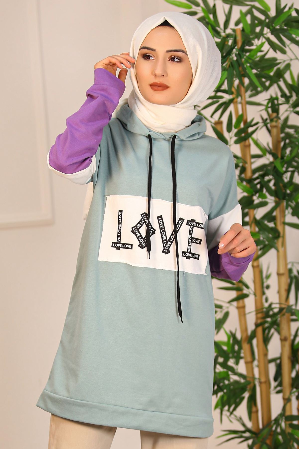 Love Baskı Kapşonlu Tunik Mint - 4515.1251.