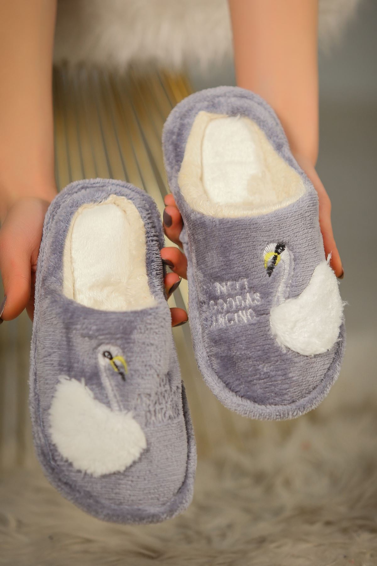 Tüylü Kuğu Baskılı Ev Terliği Füme - 8111.264.